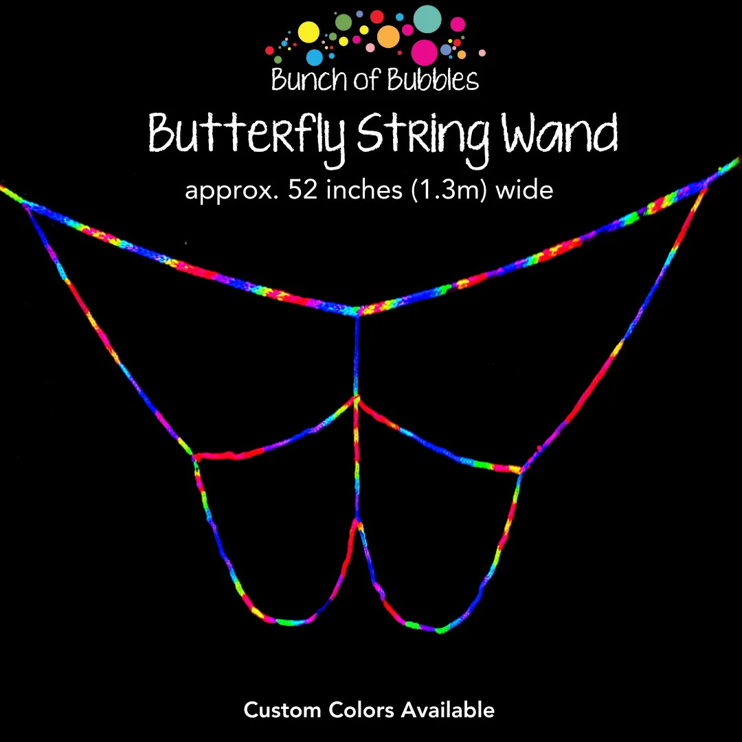 Our Butterfly String wand is designed for professionals! Hand-crocheted with acrylic yarn it’s as beautiful as it is functional. It produces large clusters of huge bubbles, and is great for breezy conditions where using a big tri-string would be a challenge.